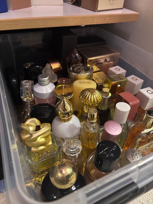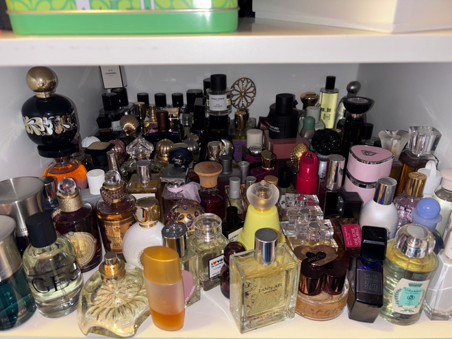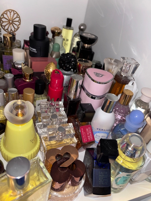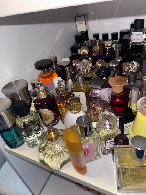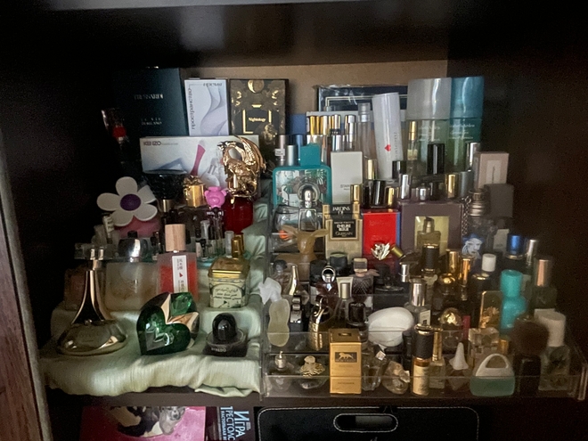 Основаная часть парфюма хранится в подвале с вином где температуру ок 17-18 градусов. В гардеробе актуальные в сезон, в ванной еще пара-тройка парфюмов которые тестирую в данный момент. Ну и по сумкам разбросаны. В течении дня использую не более 1 парфюма. Брызгаю парфюм в основном на одежду; редко на эту же одежду использую другой парфюм.
