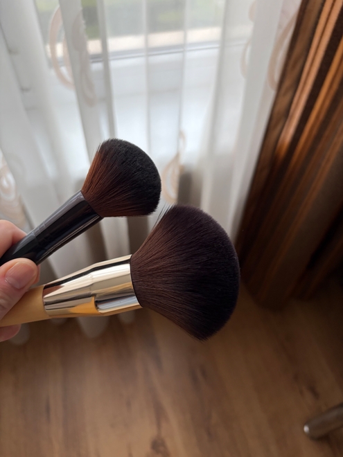 Я не поняла, что значит «совсем легко набита», возможно, это уже классическая пуховка. Наверное, этой кистью я вас не удивлю. Но именно ею чудесно пользуюсь для рассыпчатой пудры