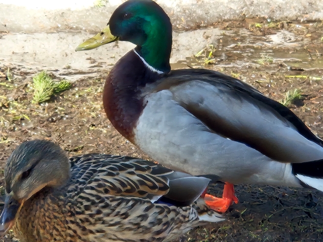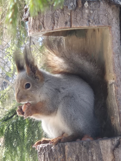 Утки уже по парам, белки ещё в зимнем, но с весенним аппетитом: