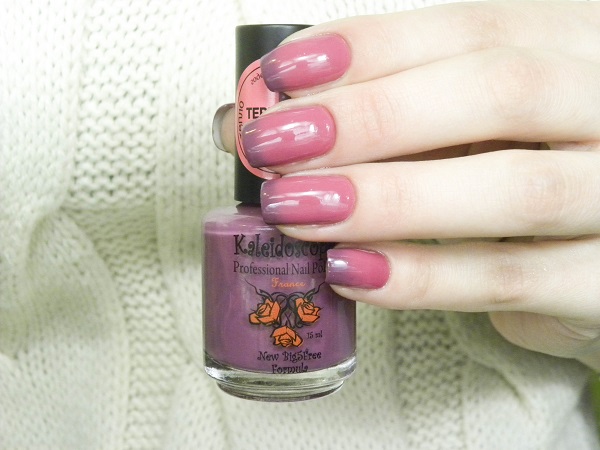 Свотчить этот термолак мне было очень непросто. Переход от одного цвета в другой менее выраженный, чем в предыдущих двух лаках. Цвет лака в теплом состоянии припыленный лилово- розовый, в холодном- припыленный серо- сиреневый. Цвет достаточно сложный и в теплом и холодном состоянии.