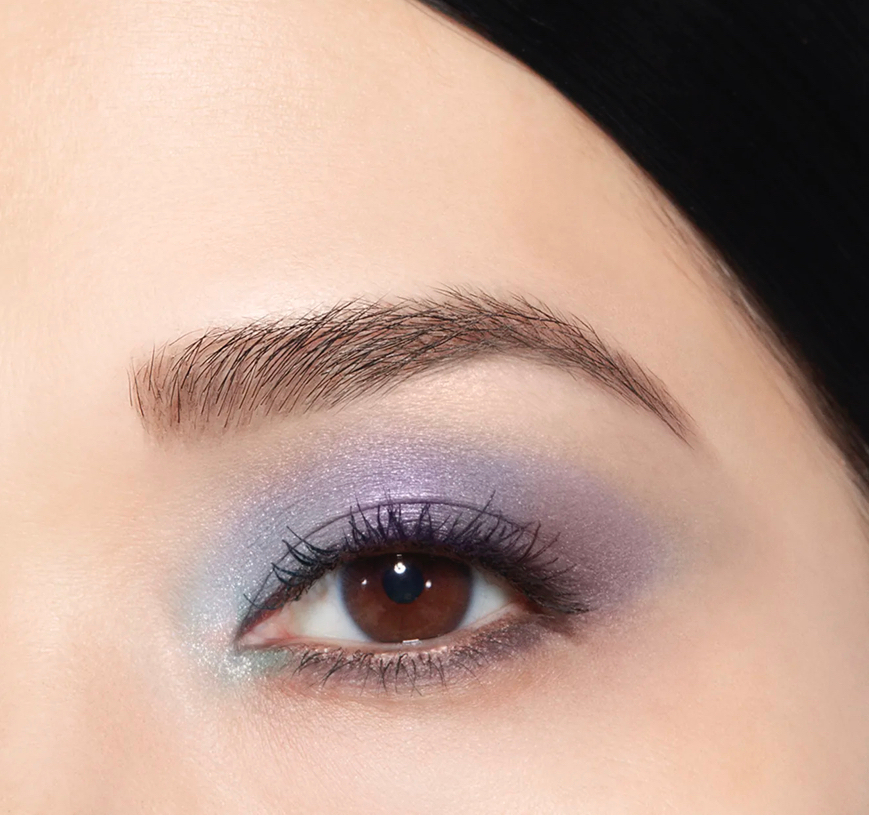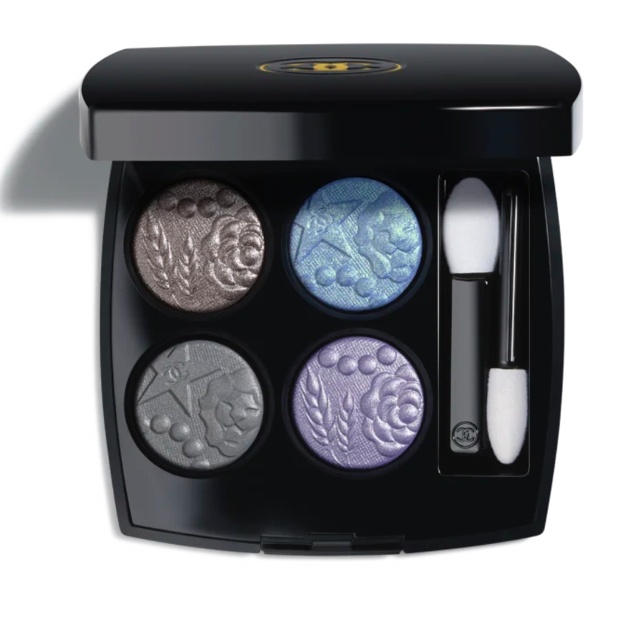 Тени для век в оттенке 397 – Nuit Astrale с четырьмя яркими оттенками: мерцающий серебристо-темно-фиолетовый, мерцающий синий, матовый голубовато-серый и атласно-лавандовый.