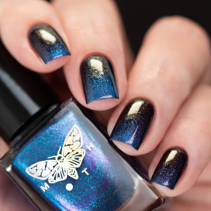 Матовый лак с необычным сочетанием синего и золотого шиммеров.