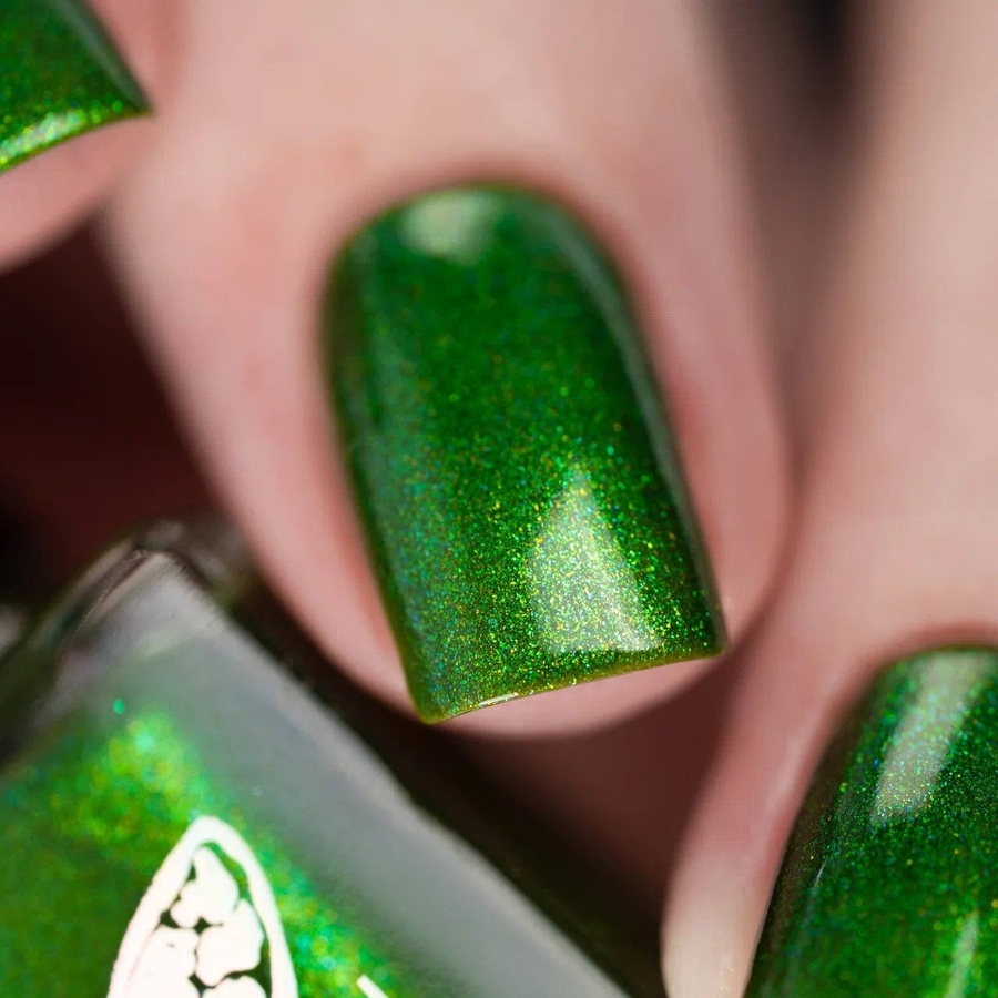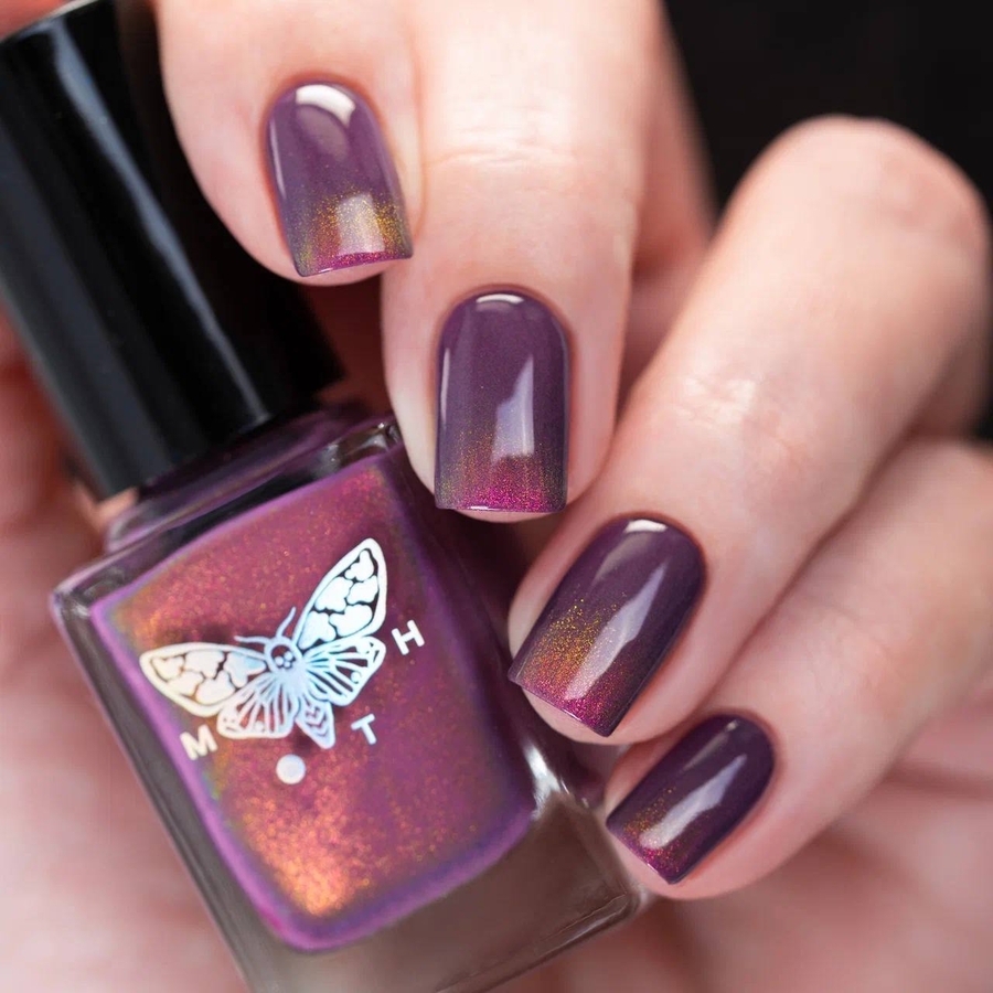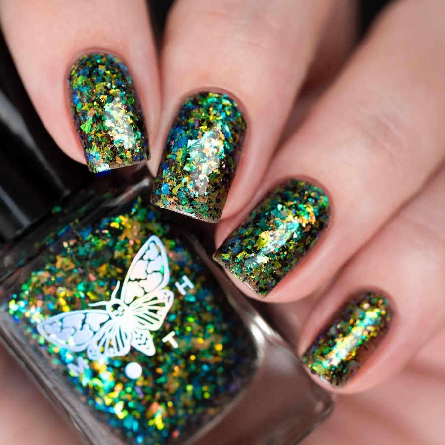 Неплотное фиолетово-бордовое желе с обилием золотисто-зелено-бирюзового шиммера.