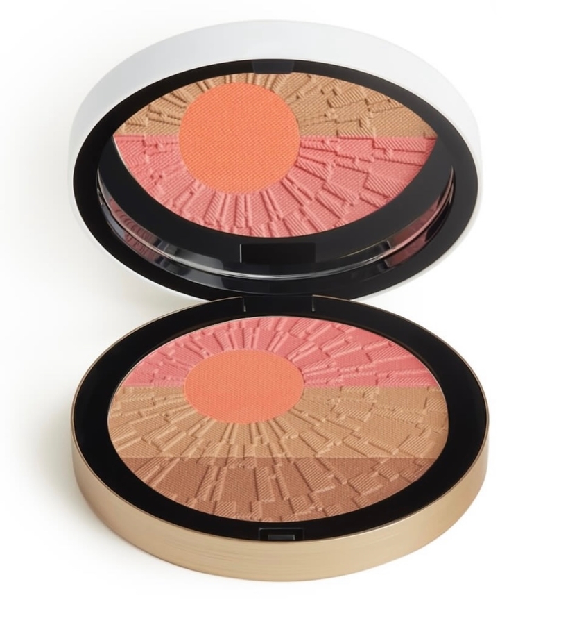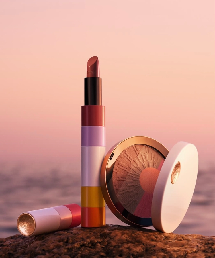 Hermès тоже выпустил мини-коллекцию, вдохновлённую средиземноморскими закатами. Палитра строится на тёплых солнечных оттенках — бронзе, персике, золотистом сиянии и мягких розово-терракотовых тонах. Такой макияж должен создавать эффект кожи, «поцелованной солнцем», и лёгкого летнего свечения.