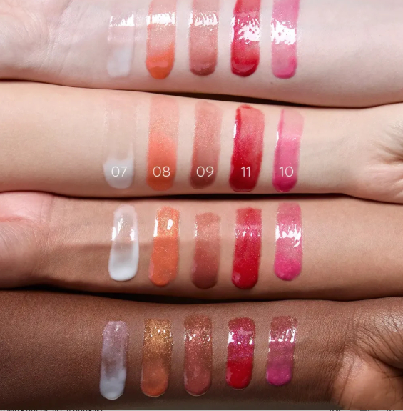 На свотчах видно, что оттенки очень прозрачные, но с эффектом глазури на губах, придающие им влажный выразительный блеск. Даже красный выглядит прозрачным, хотя и придаёт губам насыщенный оттенок.