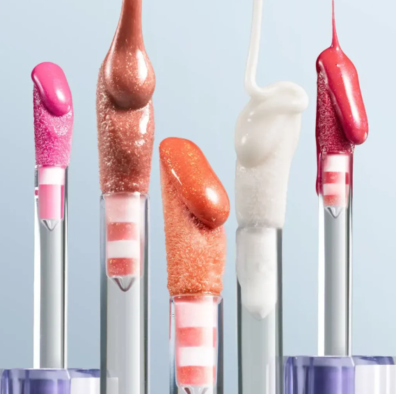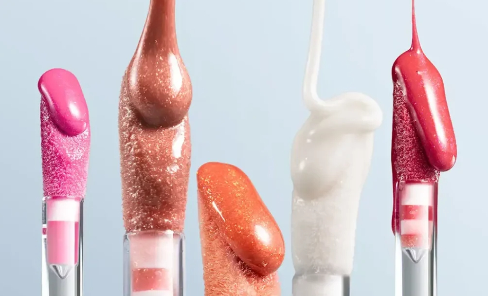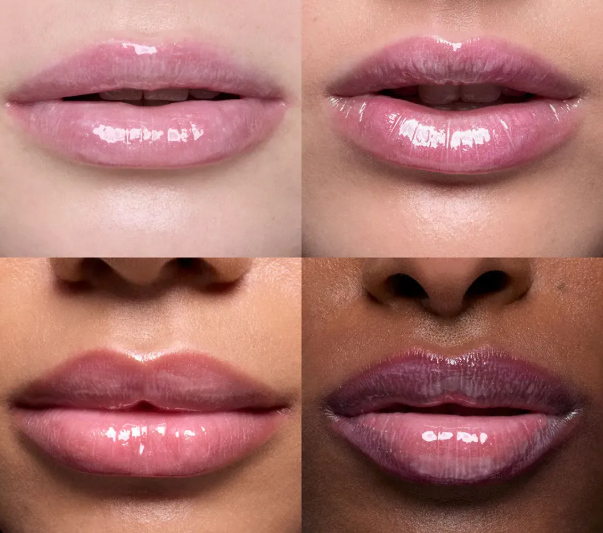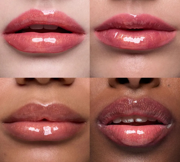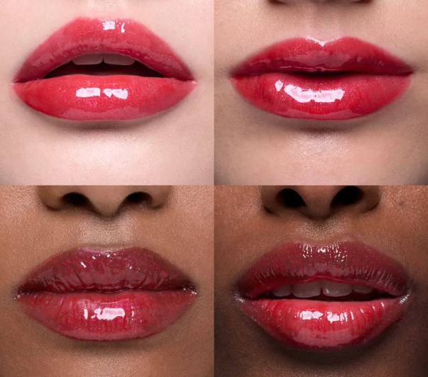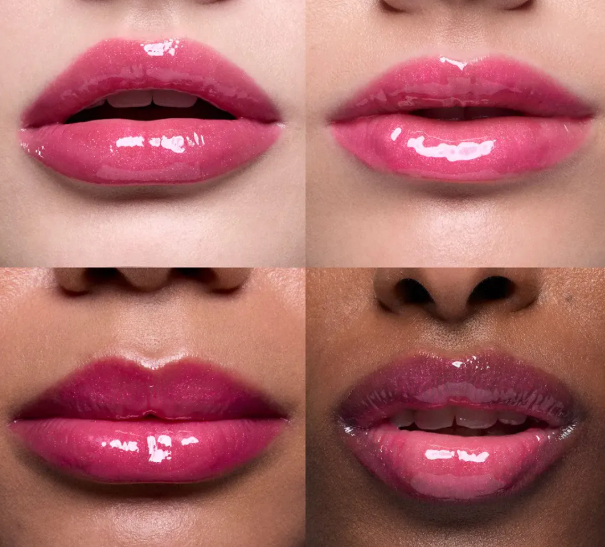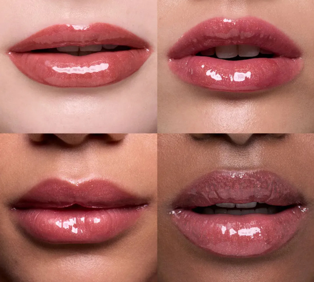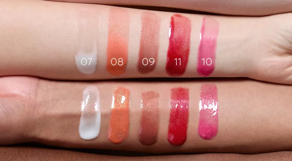 Все оттенки дают прозрачное, зеркальное покрытие на губах с яркими цветами.