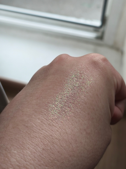 - Nymph — на мой взгляд, самый неудачный оттенок в палетке по качеству. Зелёные и золотые блёстки в зелёной полупрозрачной базе, рефилл очень сухой, приходится прямо поковырять, чтобы набрать что-то. С пальца переносится ещё хуже, чем ocean. Влажный метод нанесения оба оттенка не любят, так что остаётся только ковырять, страдать и мазать пальцем;