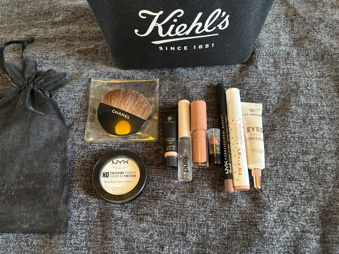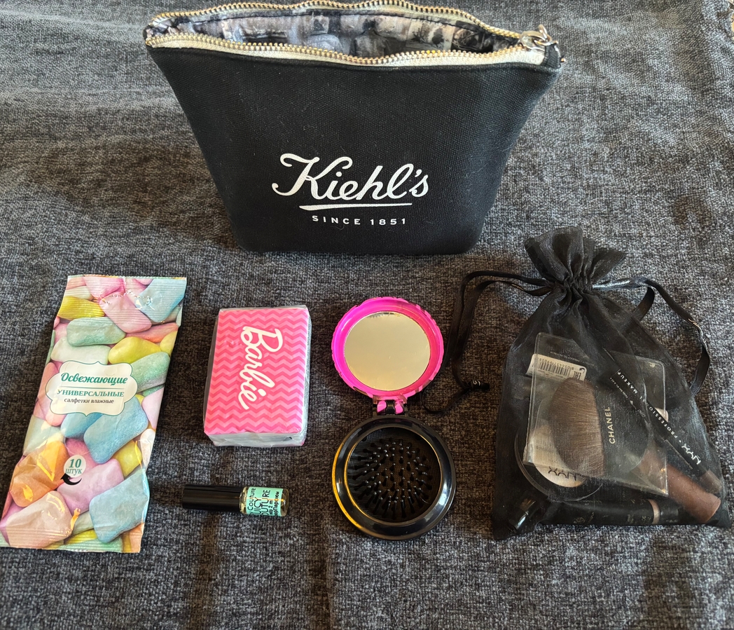 Следующая косметичка — Kiehl’s — наполнена небольшой подборкой декоративной косметики, влажными и сухими салфетками, складной расческой и еще отливантом Juicy Couture от Juicy Couture (он более ‘взрослый’, чем ароматы из серии Viva La Juicy, понравился мне меньше них).