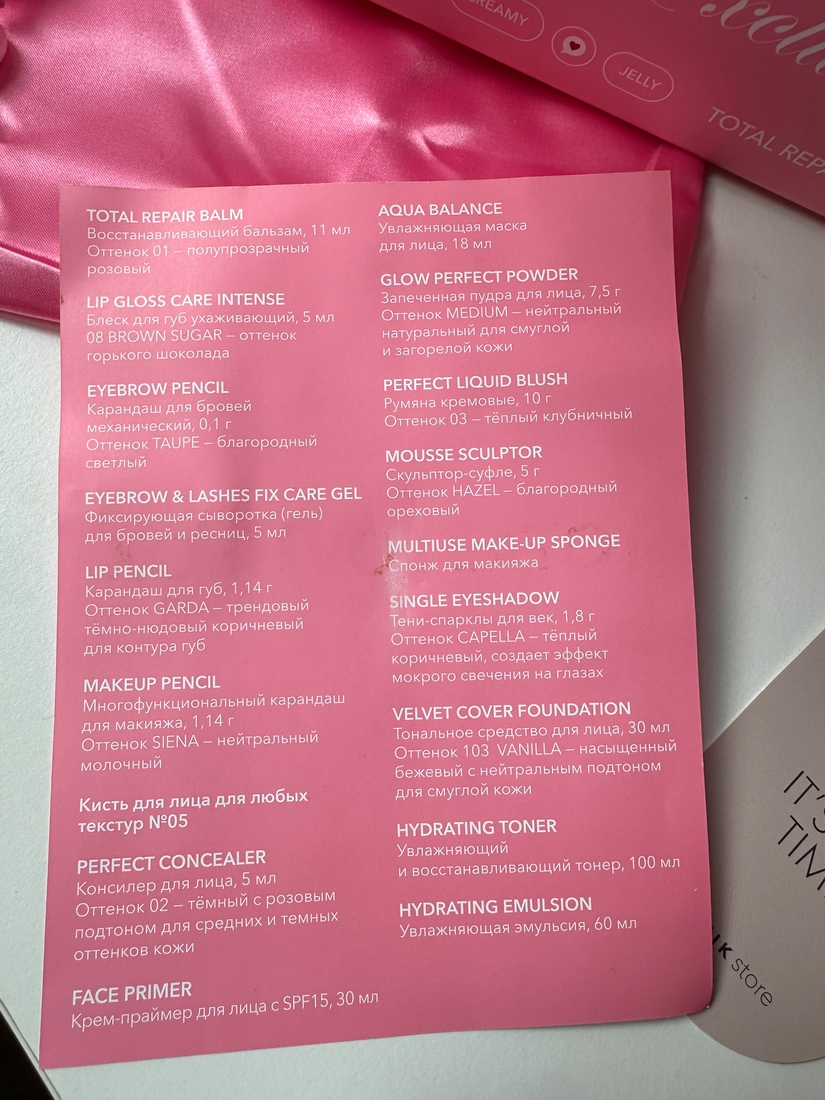 Наполнение, конечно, очень интересное, продуктов много, но где же тушь для ресниц? Где хайлайтер? Ну да ладно...