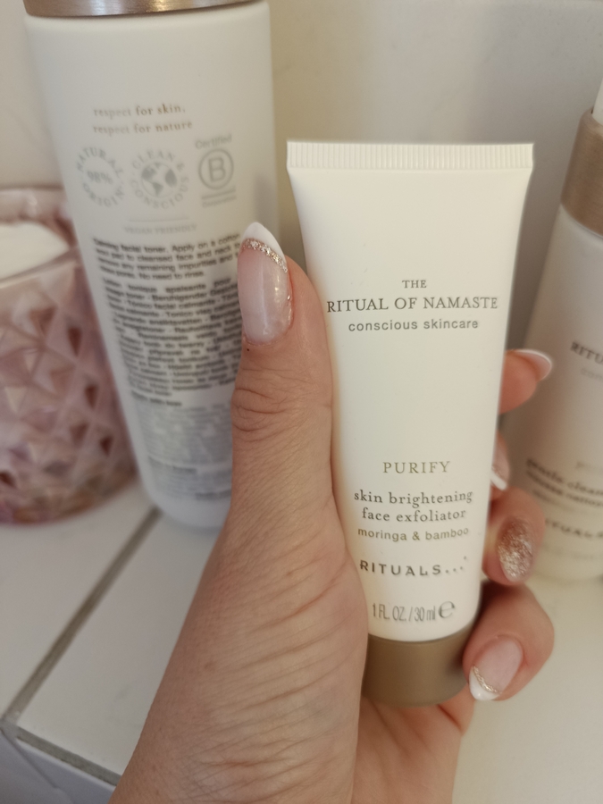Далее, так же у меня есть этой же серии эксфолиатор от RITUALS the Ritual of Namaste — skin brightening face exfoliator, как говорится, чтобы быть красивой нужно drink, sleep и exfoliate.