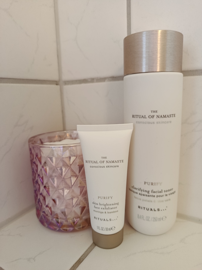 Но начну я описывать жильцов своей полки с любимого тоника от Rituals the Ritual of Namaste clarifying facial toner с морингой и священным лотосом, который я использую в комплекте с пенкой для умывания, которую подробно хвалила тут