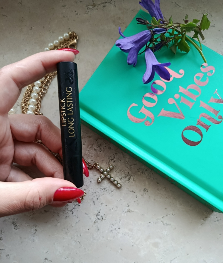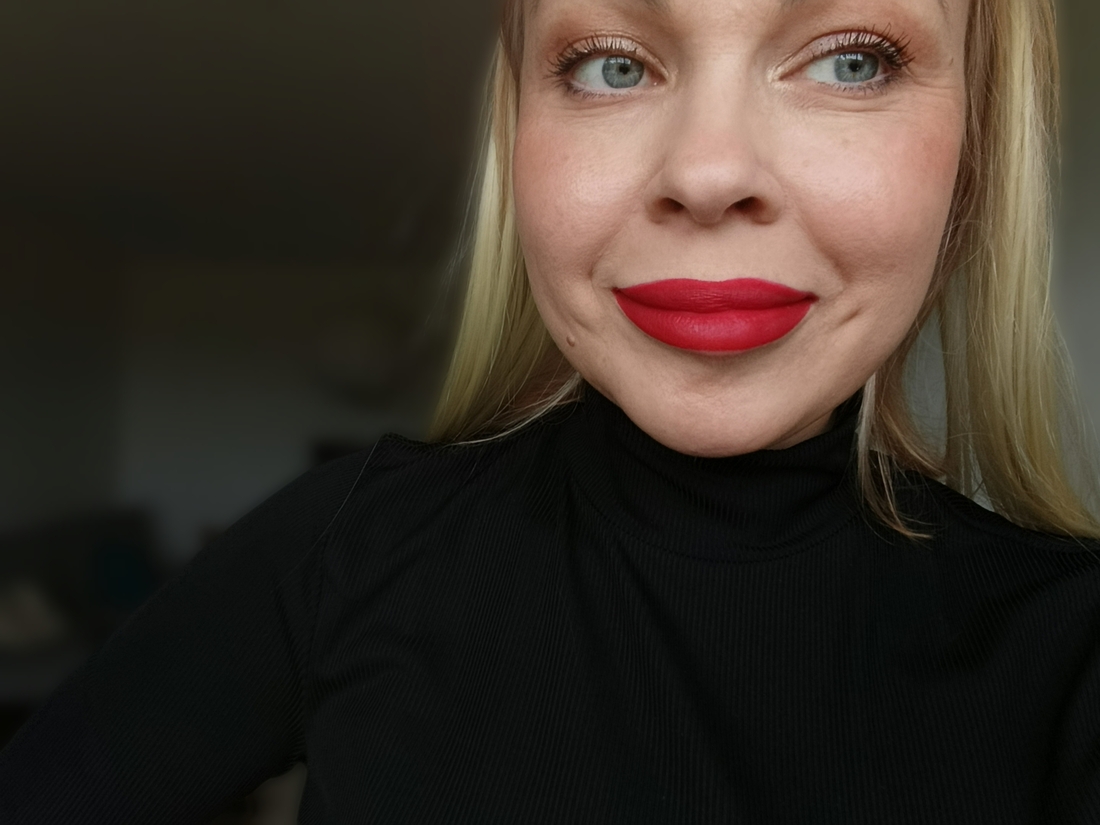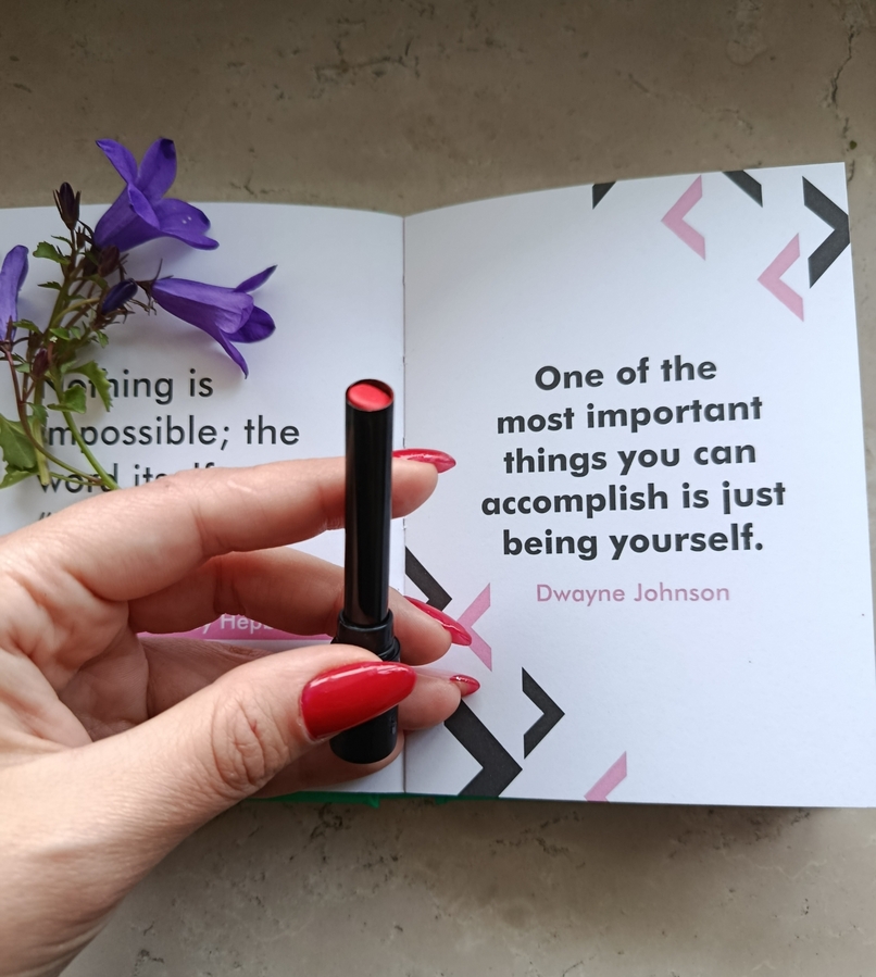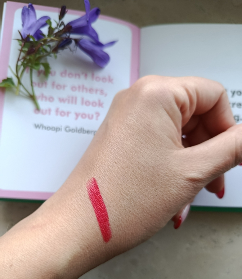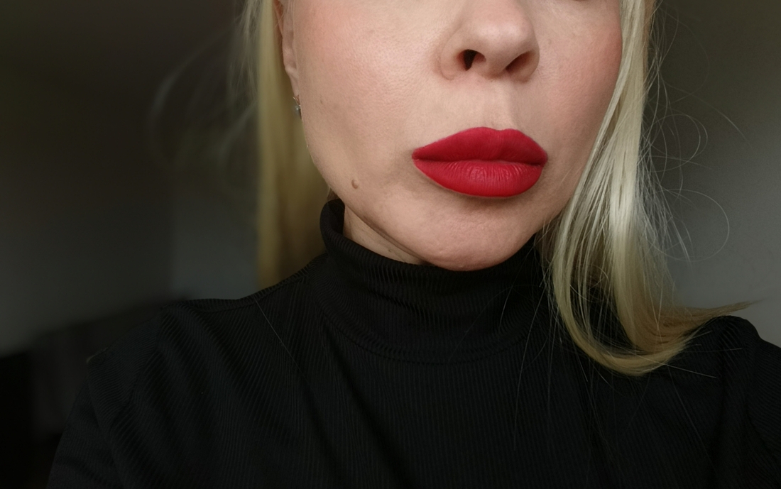 Помада очень комфортная в нанесении, я наношу ее без карандаша, она ложится мягким, ровным слоем, матовым, но не наглухо. Она не сушит губы, но держится как прибитая, выдержит перекус и останется с вами, пока вам не надоест.