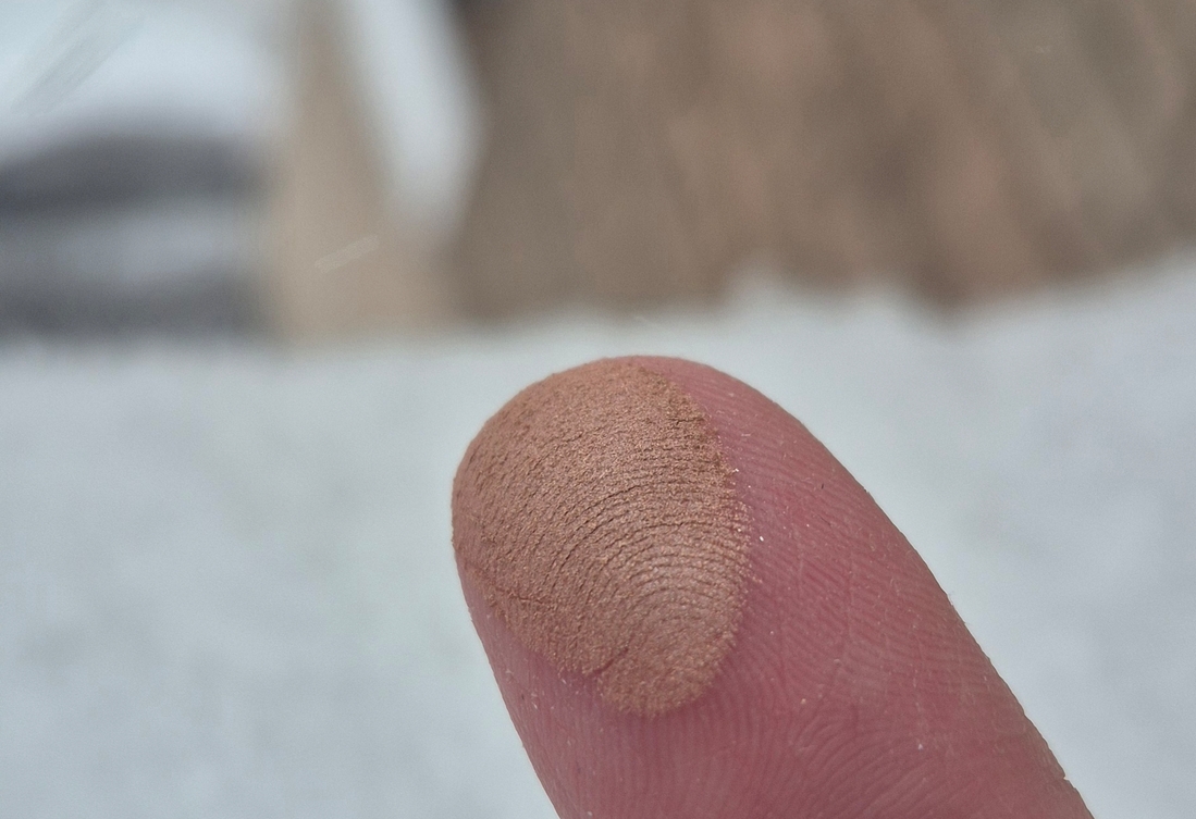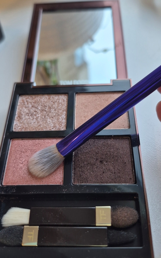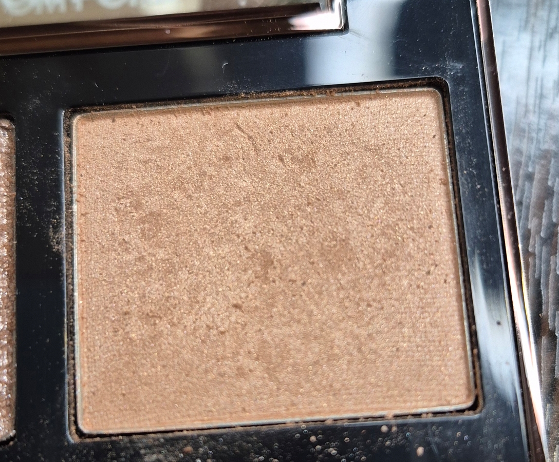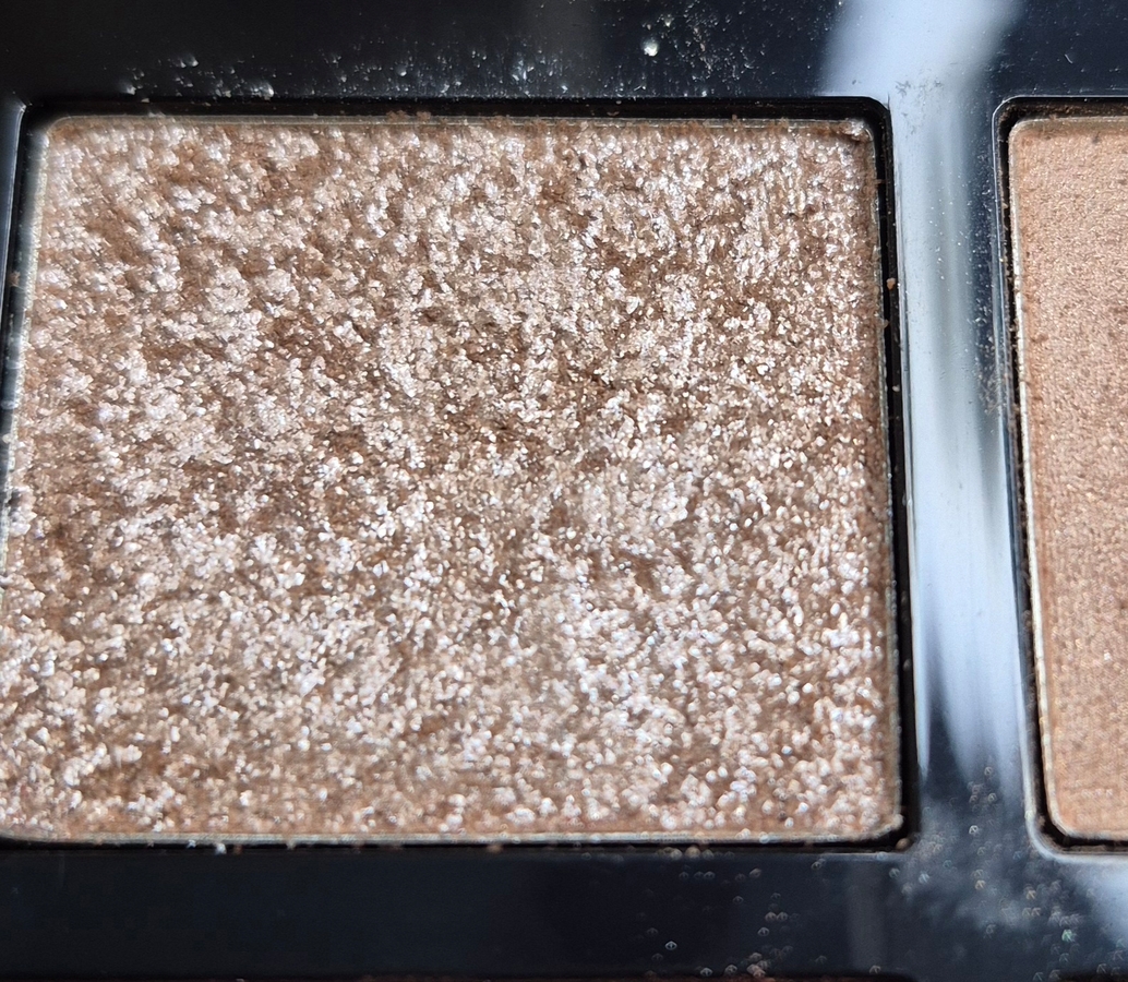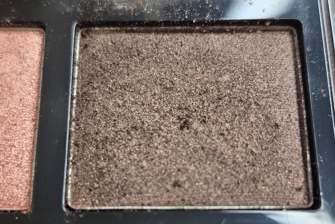 - И вот темно- коричневый оттенок- моя боль. Он предательски осыпается под глаза, его невозможно нанести с первого раза во внешний уголок, чтобы без проплешин и красиво, затемнять складку слишком, подчеркивать линию роста ресниц- значит, потом танцевать с ватной палочкой и консилером, чтобы стереть под глазами это безобразие. Наощупь масляный, податливый, на деле рыхлый. С ним нужно время, чтобы все стало аккуратно, иначе просто разведу грязь на веках (с утра это очень злит, когда времени на сборы мало)