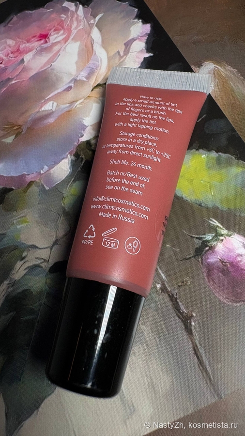 Сам тинт находится в приятном мягком матовом тюбике, весьма внушительного объема для такого рода продуктов — 12 мл. Хватит точно надолго даже если его использовать наслаивая и не только как румяна.