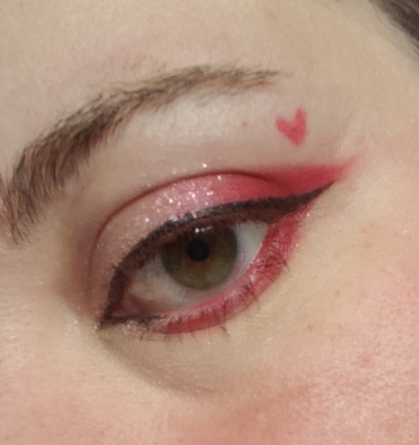 Второй макияж вдохновлён Днём Святого Валентина и сделан оттенками 2, 3, 4 и 5. Оттенок 2 в основе макияжа, чтобы было чуть легче тушевать. В складку нанесла капельку оттенка 5, который потом до остервенения тушевала, а оттенком 3 попыталась вывести стрелку и нарисовала сердечко. Ну и сияшка во внутренний угол. Также оттенок 3 добавила на слизистую, но не советую повторять.