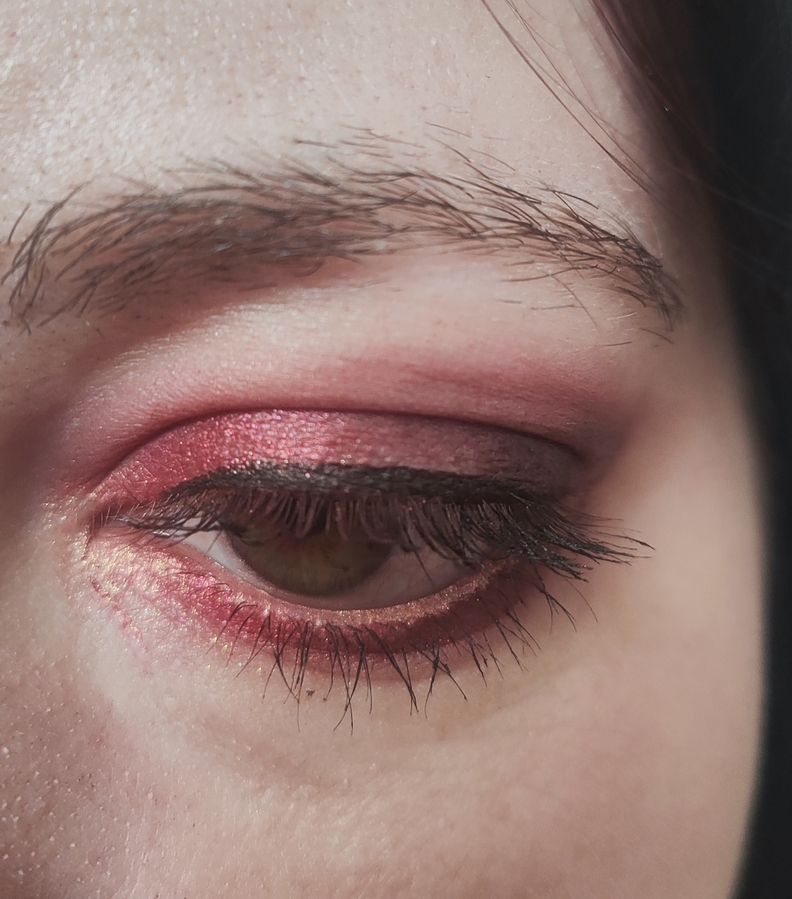Здесь хорошо видно, как бордовый пятнит и не хочет растушёвываться, несмотря на подложку из розовых теней, но повторюсь, на коже он ведёт себя куда лучше. А ещё он сыпется, если наносить кистью.