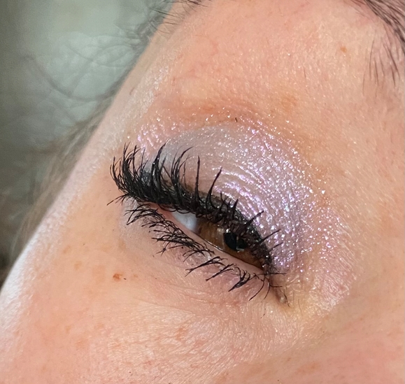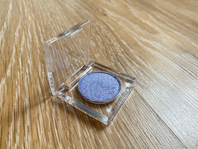 В рефиле он выглядит как сиреневый с серебряном блеском. При нанесении кистью дает полупрозрачное покрытие, даже не виден этот сиреневый отлив, так что можно предавать акцент на тенях любого оттенка.