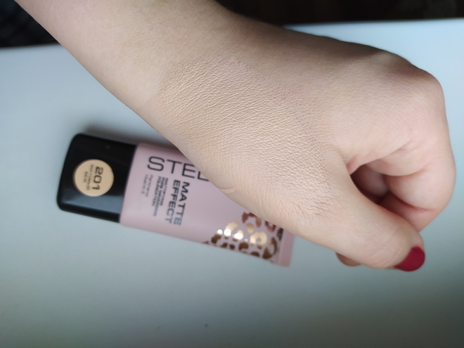 Текстура становится пудровой при растушевке. Не требует дополнительного закрепления пудрой ввиду матового финиша.