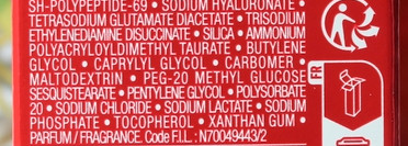 aqua / water / eau, glycerin, rhamnose, alcohol denat, niacinamide, dimethicone, hydroxyethylpiperazine ethane sulfonic acid, hydrolyzed rice protein, adenosine, citric acid, grifola frondosa fruiting body extract, hydroxyacetophenone, palmitoyl tetrapeptide-7, palmitoyl tripeptide-1, sh-polypeptide-69, sodium hyaluronate, tetrasodium glutamate diacetate, trisodium ethylenediamine disuccinate, silica, ammonium polyacryloyldimethyl taurate, butyleneglycol, caprylyl glycol, carbomer, maltodextrin, peg-20 methyl glucose sesquistearate, pentylene glycol, polysorbate 20, sodium chloride, sodium lactate, sodium phosphate, tocopherol, xanthan gum, parfum / fragrance. code f.i.l: n70049443/2