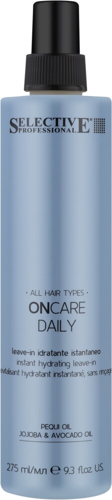Несмываемый увлажняющий спрей для волос Selective Professional Oncare Daily Instant Hydrating Leave-In предназначен для ежедневного ухода за волосами, которым требуется мягкое увлажнение и защита без утяжеления. Продукт удобно использовать сразу после мытья — его лёгкая текстура равномерно распределяется по влажным или сухим волосам, не требует смывания и не оставляет липкости. Спрей делает пряди более гладкими, послушными и лёгкими в укладке, улучшая их внешний вид уже с первого применения. Подходит для всех типов волос, особенно полезен в условиях городской среды, при сухом воздухе или частом использовании фена. Продукт можно использовать как базовый уход или как дополнительный этап в комплексной системе восстановления. Сбалансированная формула работает бережно и эффективно, сохраняя ощущение свежести и лёгкости в течение всего дня.