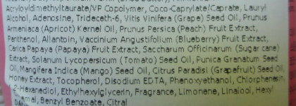 water, ethylhexyl palmitate, glycerin, butylene glycol, cetyl alcohol, glyceryl stearate, polysorbate 60, dimethicone, peg-100 stearate, palmitic acid, sorbitan stearate, stearic acid, stearyl alcohol, sodium polyacrylate, ethylhexyl stearate, myristyl alcohol, butyrospermumparkii (shea) butter, ammonium acryloyldimethyltaurate/vp copolymer, coco-caprylate/caprate, lauryl alcohol, trideceth-6, vitisvinifera (grape) seed oil, prunusarmeniaca (apricot) kernel oil, prunuspersica (peach) fruit extract, panthenol, allantoin, alcohol, vacciniumangustifolium (blueberry) fruit extract, carica papaya (papaya) fruit extract, saccharumofficinarum (sugarcane) extract, 1,2-hexanediol, solanum lycopersicum (tomato) seed oil, punicagranatum seed oil, mangiferaindica (mango) seed oil, citrus paradisi (grapefruit) seed oil, honey extract, ethylhexylglycerin, tocopherol, tris(tetramethylhydroxypiperidinol) citrate, disodium edta, phenoxyethanol, chlorphenesin, fragrance