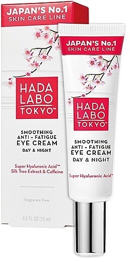 Крем для глаз от признаков усталости Hada Labo Tokyo Smoothing Anti-Fatigue Eye Cream Day & Night уменьшает морщины и признаки усталости, разглаживает кожу вокруг глаз. Содержит коллаген и экстракт розового шелкового дерева, которые обладают омолаживающими и укрепляющими свойствами, а также кофеин, который устраняет круги под глазами и отёчность.