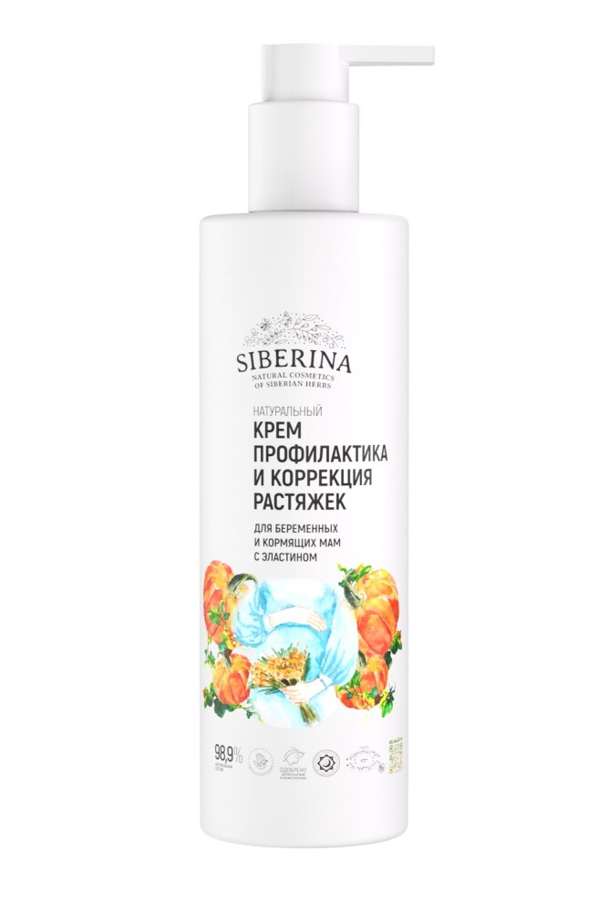 Натуральный крем «Профилактика и коррекция растяжек» для беременных и кормящих мам Siberina обеспечит оптимальное увлажнение и питание кожи, сделает ееёболее эластичной и поможет подготовиться к предстоящим нагрузкам. Кроме того, использовать крем рекомендуется и после родов: его сбалансированная формула разглаживает и регенерирует кожу, помогая ей быстрее восстановиться после растяжения. Благодаря высокому содержанию жирных кислот масло кокоса органик эффективно работает против растяжек и дряблости кожи: помогает поддерживать тонус, предотвращает появление рубцов и уменьшает уже имеющиеся. Масло тыквы борется с шелушением и сухостью, подтягивает кожу, делая ее бархатной и упругой. Кроме того, масло гипоаллергенно, что очень важно для беременных, т.к. в этот период кожа часто становится более чувствительной. Эластин - хорошее профилактическое средство от растяжек: он ускоряет выработку собственного коллагена и эластина в клетках, помогает удерживать влагу, выравнивает рельеф кожи. Д-пантенол и экстракт прополиса обладают отличными смягчающими и заживляющими свойствами.