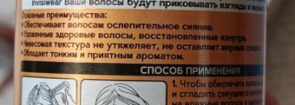 Чтобы придать волосам дополнительный уход и сгладить секущиеся кончики, нанесите средство на влажные волосы и высушите феном. Для завершения красивого результата причёски, придания им блеска и ухоженного вида, нанесите средство с расстояния 20-25 см по всей длине на сухие волосы.