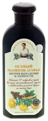 Особый шампунь от выпадения и ломкости волос Рецепты Бабушки Агафьи создан на настое 17 сибирских трав, красного можжевельника и байкальского золотого корня на талой воде, с добавлением мумие. С давних пор в мудрой народной практике использовалась талая вода: приносили в избу полное корыто снега или льда и ждали, когда он растает… а после использовали для оздоровления. Содержание в шампуне талой воды обеспечивает очень мягкую основу для мытья, а в сочетании с удивительными по своим природным свойствам компонентами – горный бальзам мумие, байкальский золотой корень и красный можжевельник - спасет волосы от выпадения, придаст им прочность и обеспечит здоровый рост.