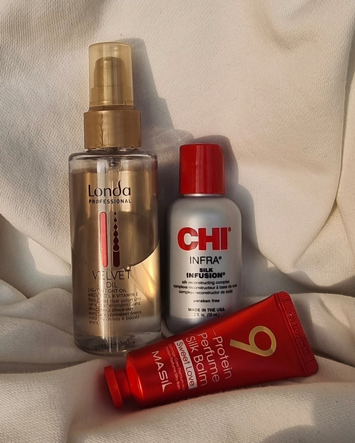 Мой несмываемый уход для гладкости и блеска волос: бальзам для волос Masil 9 Silk Balm, масло для волос Londa Velvet Oil и шелк для волос CHI Silk Infusion