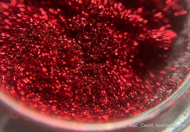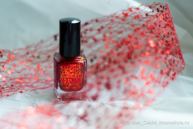 По цвету это нейтральный красный лак, в базе чувствуется легкая сине-розовая нотка. Наполнение из голографических микрохлопьев очень обильное, созает эффект рассеянной голографии.
